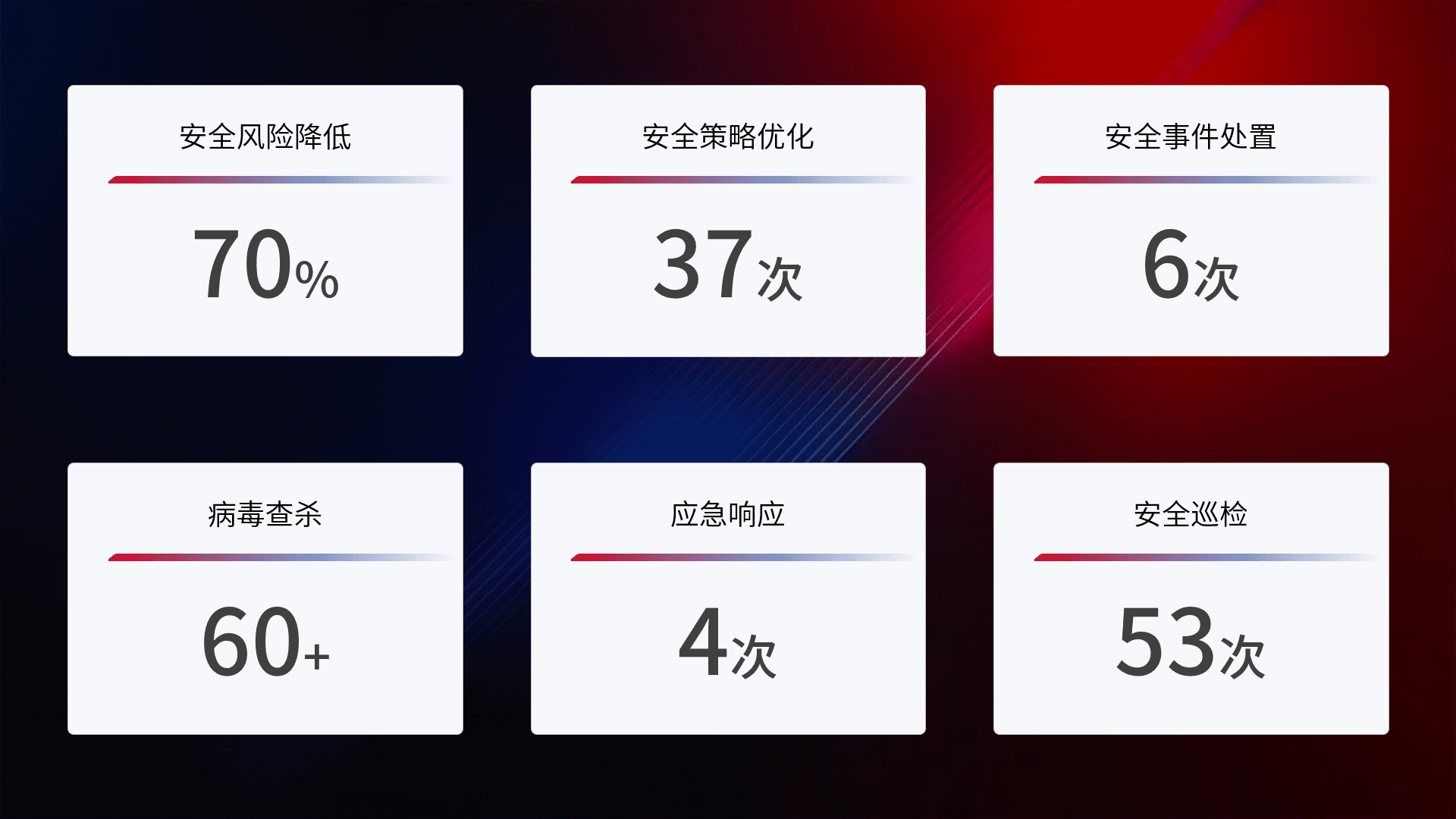 提供全面的安全事件报告体系,,,包括处置报告、、、、周报、、、季度和年度总结,,,,结合持续监控,,帮助客户深入了解网络安全状况。。